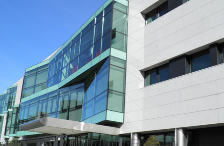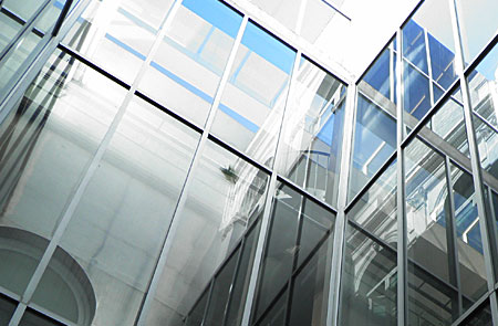 Las tapas que ocultan las juntas de unión vidrio-vidrio, resaltan así las tramas vertical y horizontal de lo montantes y travesaños estructurales de estas fachadas.